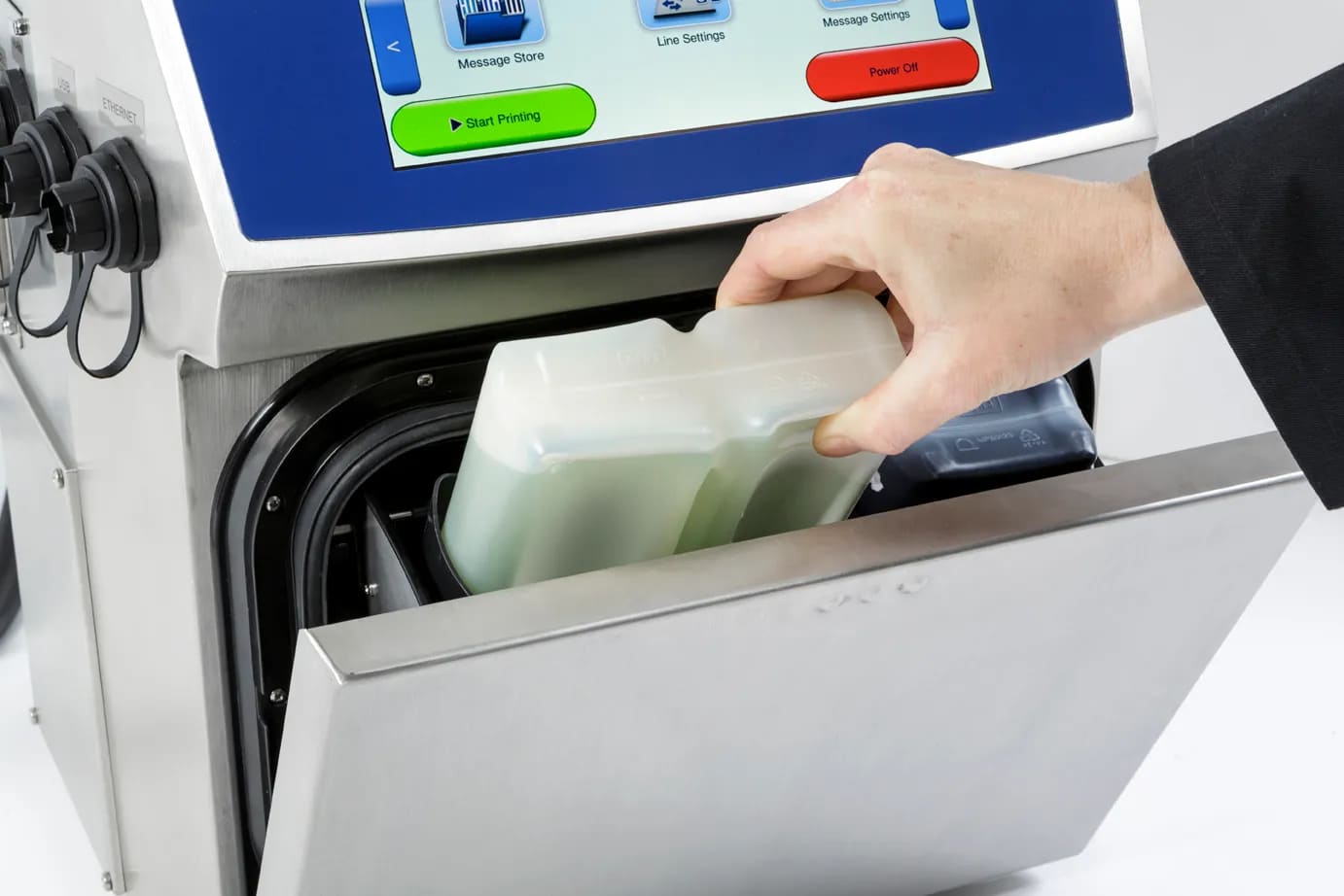 - USB port for copy and back-up of message and printer settings, and for easy transfer of messages between printers, and downloading of output and line stoppage logs