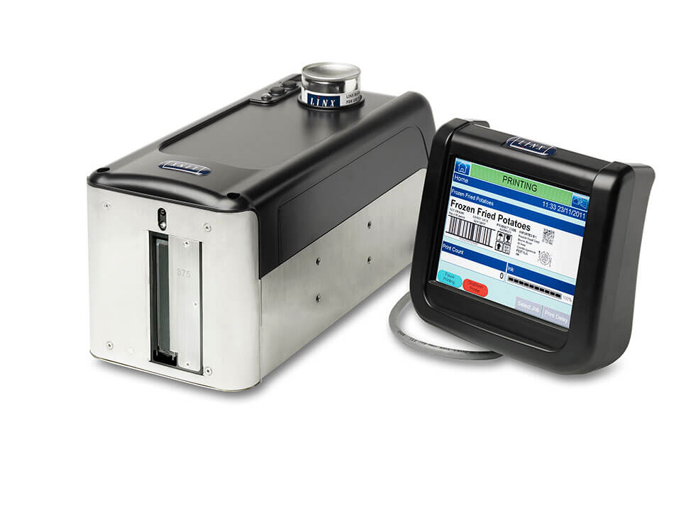 Linx IJ375 large character case coding machines offer a cost-effective alternative to labels and preprinted boxes. They can print text, logos, and graphics up to 2.76 inches (IJ375) high onto porous substrates such as paper, card, and wood.
