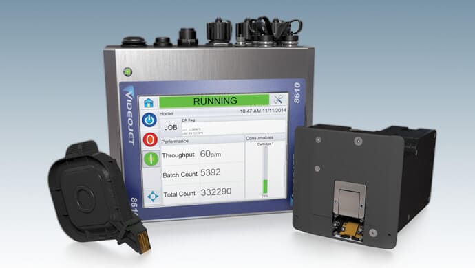 The Videojet 8610 thermal inkjet (TIJ) printer utilizes a revolutionary, purpose-built cartridge designed to use MEK fluids. You can now bring the simplicity of thermal inkjet to applications that require printing of crisp, repeatable codes on foils, films, plastics and coated stocks. Ideally suited for applications in food processing, cosmetics, and pharmaceuticals, the 8610 combines high-resolution printing of customer-facing and supply chain information with incredibly simple operation.